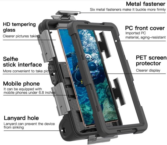 De tweede generatie duikkoffer is voorzien van upgrades zoals composiet metalen bevestigingen, vouwsnaps en extra sluitingen voor telefoons met volumeknoppen aan beide zijden. De hoes biedt volledige bescherming terwijl je toch eenvoudig foto's en video's kunt maken. Met een sterke draagkoord en eenvoudige bediening is deze duikkoffer ideaal voor avonturiers die graag hun telefoon willen gebruiken tijdens watersporten en andere buitenactiviteiten.